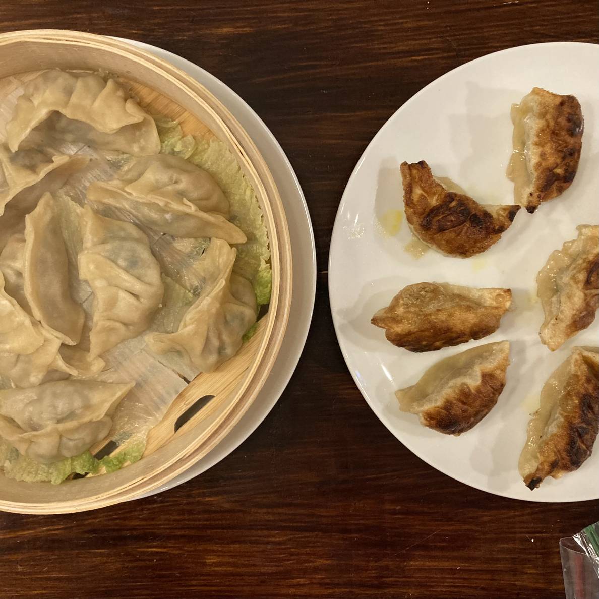 I had 17 dumplings that wouldn’t fit in the steamer, so froze them. Later in the week I cooked six of those following Kenji’s “dumpwings” instructions. I was most worried about the starchy layer sticking to the pan, but that wasn’t a problem at all. I think I should’ve let them cook even longer to get a browner and crispier starch layer. As it was, the top of the starch layer had a bit of gummy-ness to it.